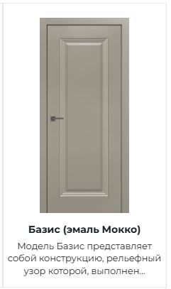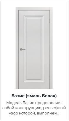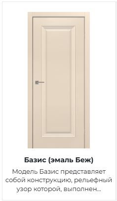 Модель Базис представляет собой конструкцию, рельефный узор которой, выполнен по скиновой технологии, где объем достигается путем прессования МДФ-плиты. Поверхность полотна обрабатывается грунтом и окрашивается в два слоя полиуретановой эмалью, на которую в будущем может быть нанесен любой желаемый цвет. Эмаль покрыта защитным лаком, что позволяет сохранить прочность, экологичность и отличный внешний вид двери.
