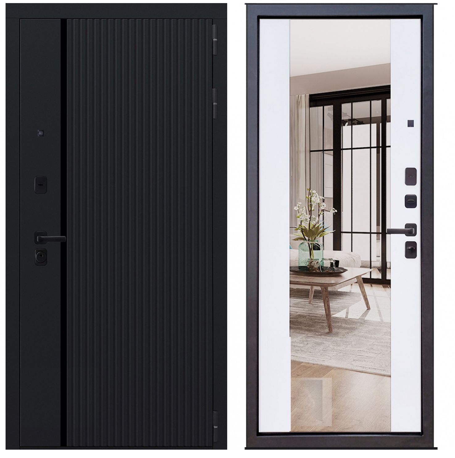 Отделка: 10 мм фрезерованная панель МДФ, Черный кварц / 16 мм фрезерованная съемная панель МДФ, Soft белый, зеркальная вставка 465*1920 мм